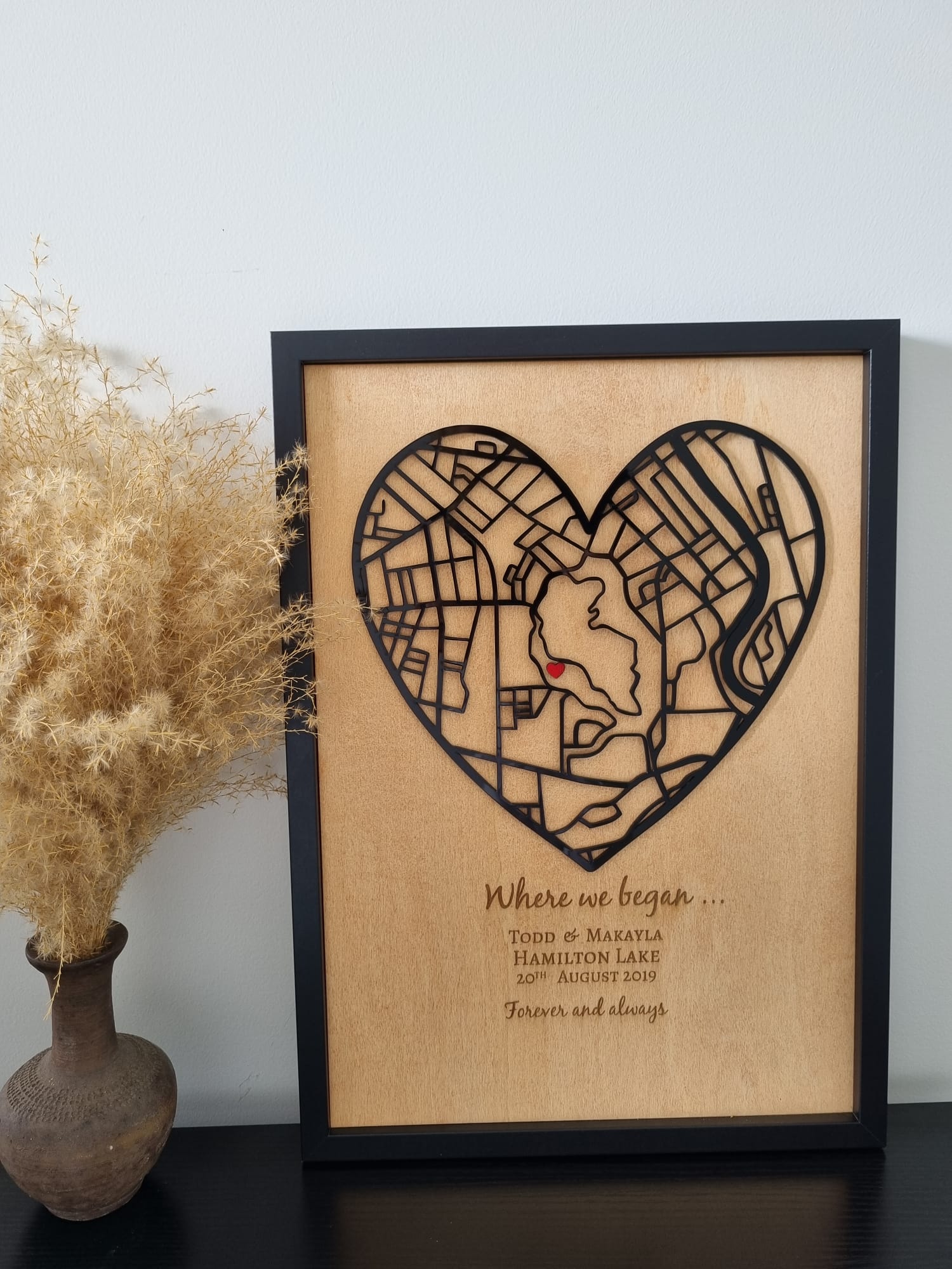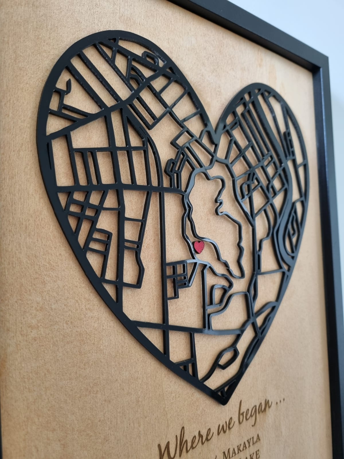 Map is cut from acrylic, and words engraved on stained wood cut to A3 size.